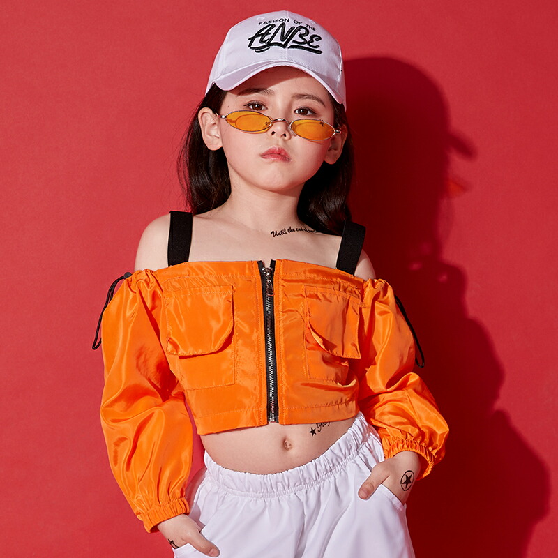 楽天市場 キッズダンス衣装 上下2点セット オフショルダー トップス ロングパンツ 韓国風 K Popダンス セットアップ 肩出し かわいい 長袖 無地 長ズボン ヒップホップダンス ブレイク オレンジ へそ出し ショート丈 シンプル 練習用 発表会 シンプル 女の子 ジュニア